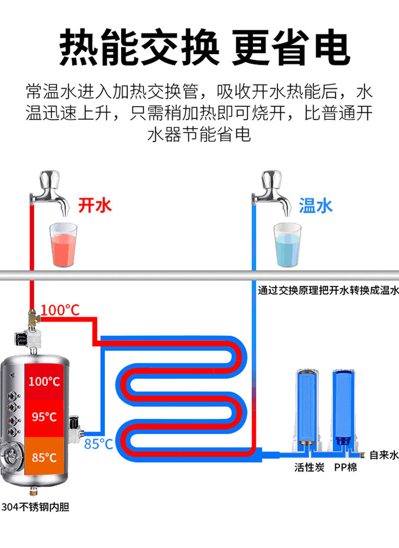自來水經(jīng)過PP濾芯和活性炭濾芯的過濾之后到達(dá)熱交換器外管,預(yù)熱至85度,如需飲用熱開水則到電熱開水器中加熱至100度,如需飲用溫開水則到熱交換器內(nèi)管降溫至35度左右。