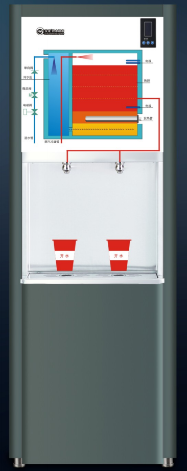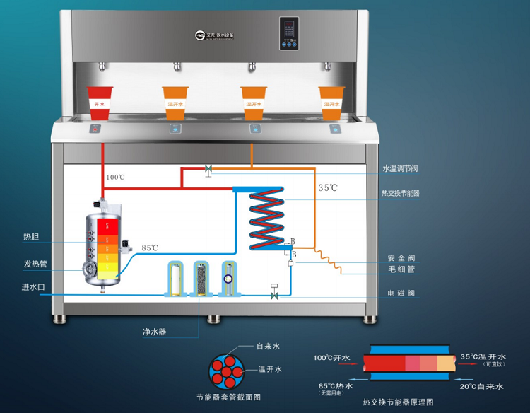 通過水膽內(nèi)的開水→100°C開水→熱交換器(內(nèi)管)→物理降溫至35°C→溫開水直飲